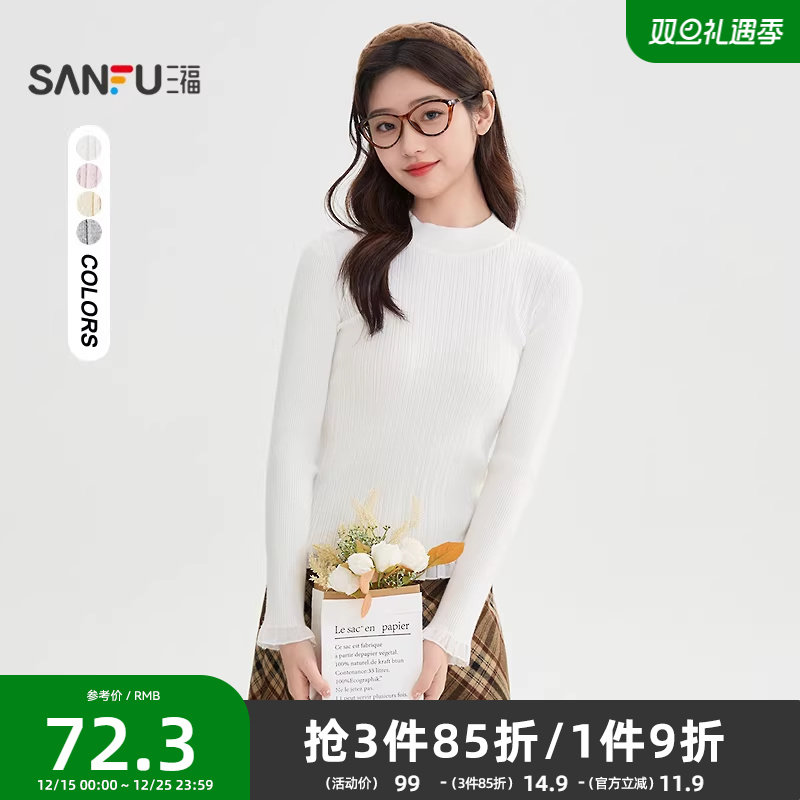 #三福打底毛衫2025冬季小中领荷叶边袖净色内搭上衣女装504417