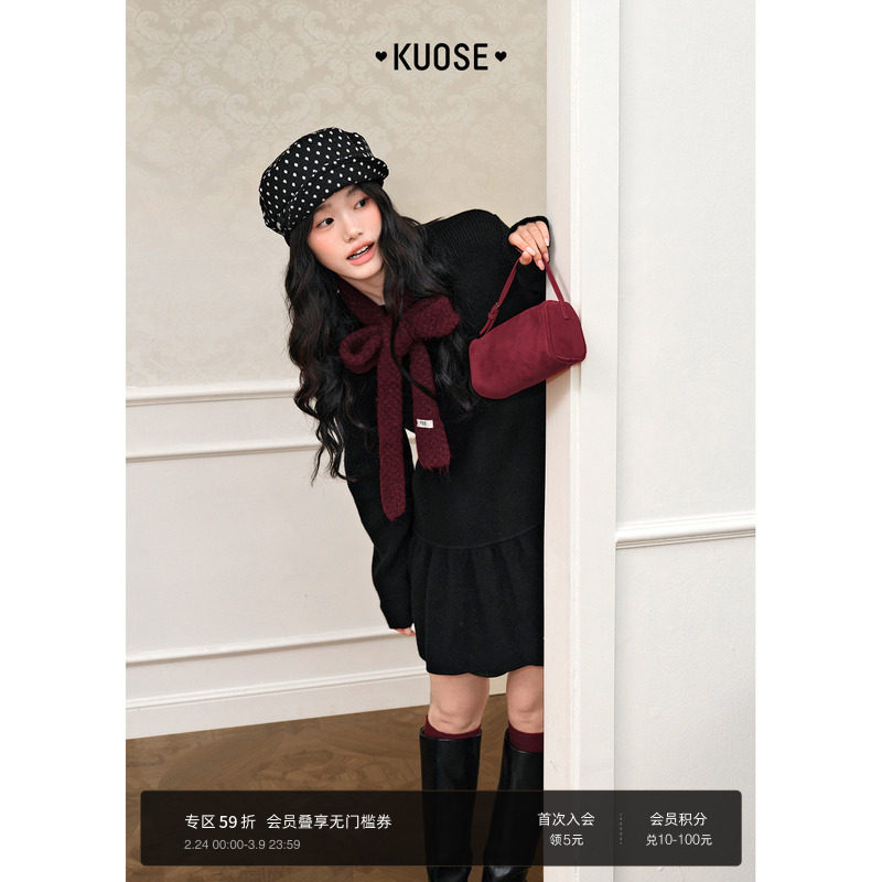 阔色黑色慵懒感针织衫毛衣女2025秋冬季新款荷叶边长袖连衣裙短裙