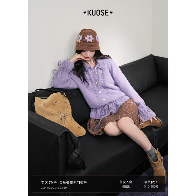 阔色紫色荷叶边针织开衫外套女2025秋冬季新款翻领温柔风穿搭毛衣