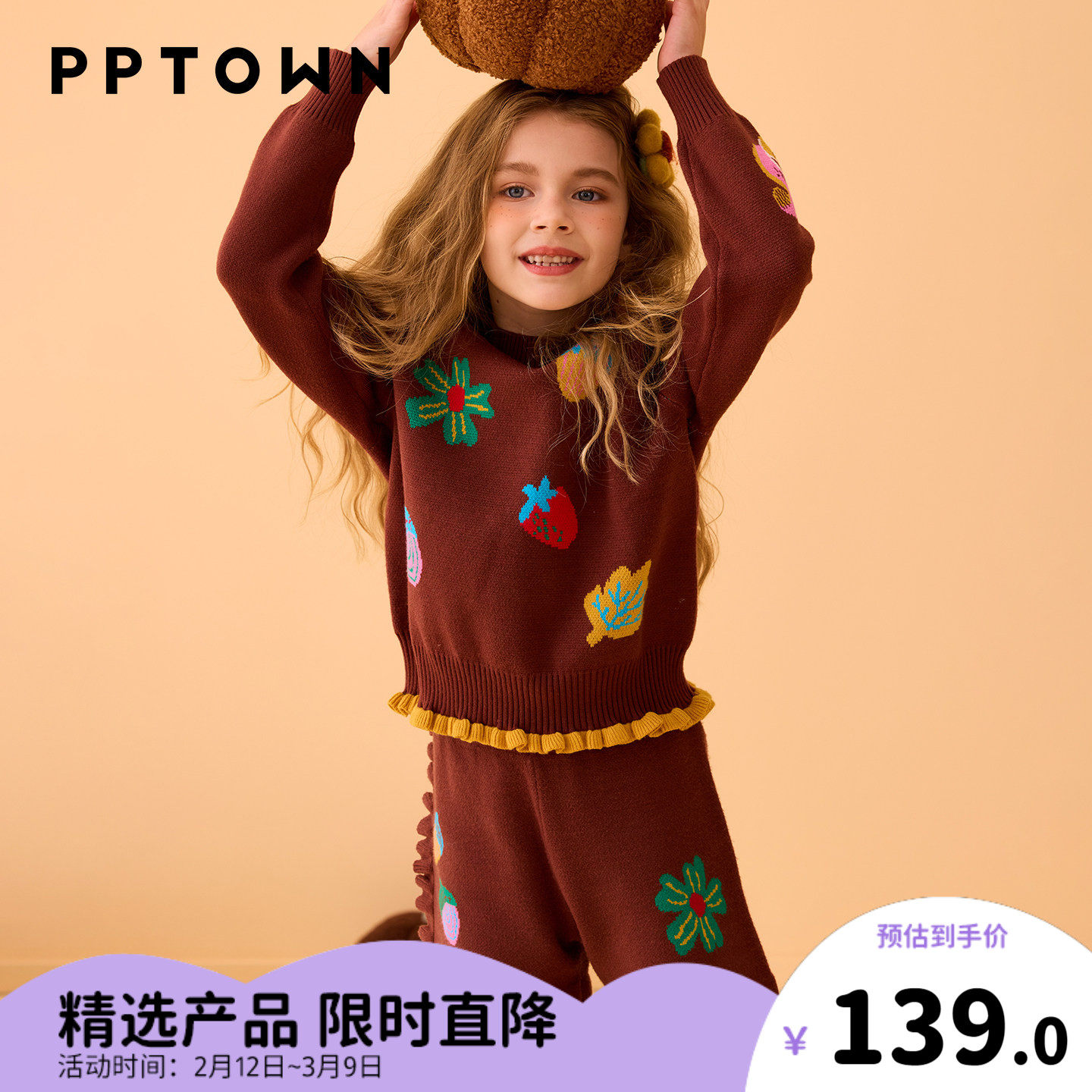 【SEQB小象Q比】女童荷叶边领针织衫甜美花朵图案毛衣两件套套装
