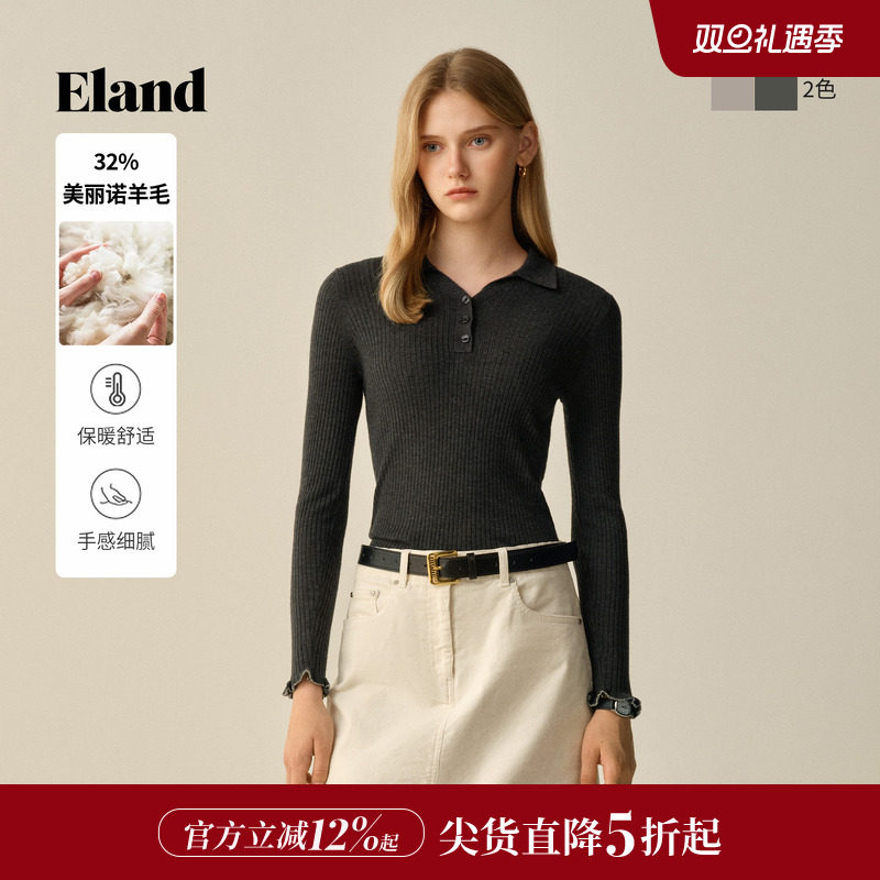 Eland衣恋毛衣女柔美荷叶边袖口合身显瘦针织衫2025冬季新款