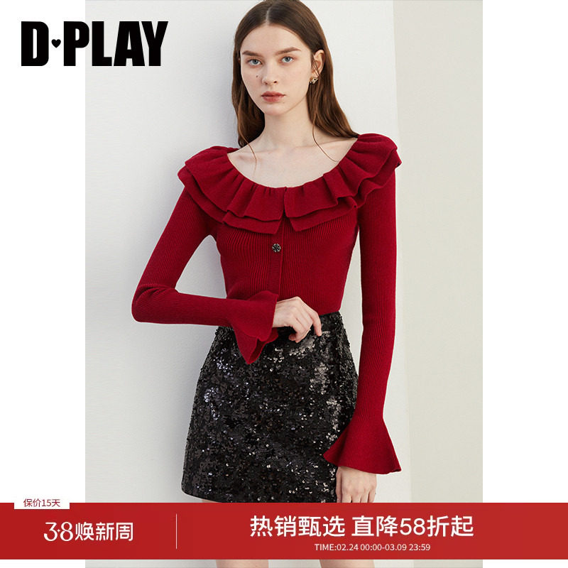 DPLAY2025秋季新款红色毛衣女U领荷叶边新年针织衫修身长袖上衣