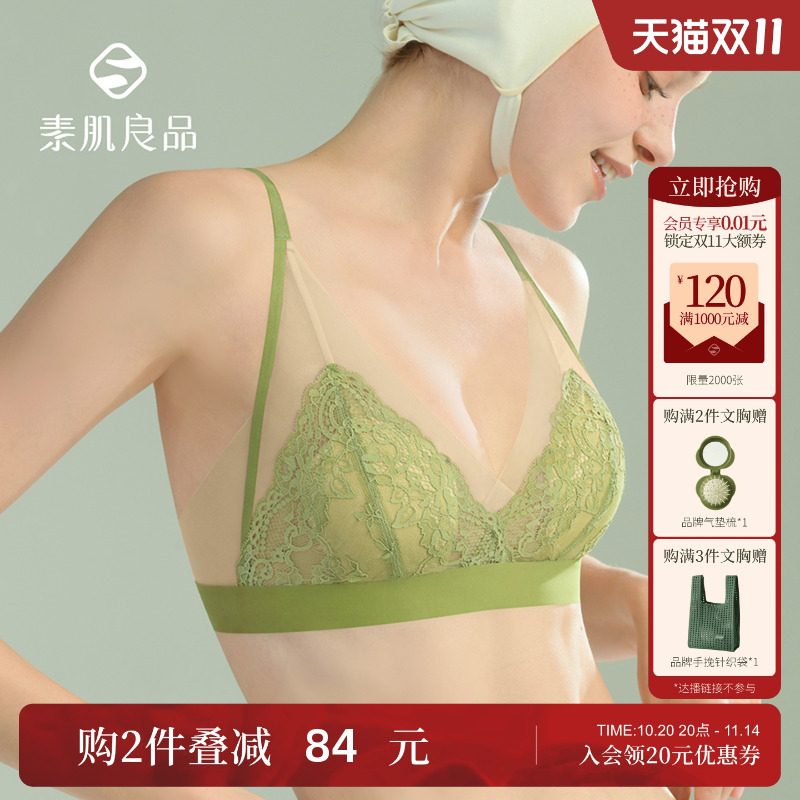 素肌良品无痕美背内衣薄款蕾丝文胸无钢圈性感奶罩三角杯法式胸罩