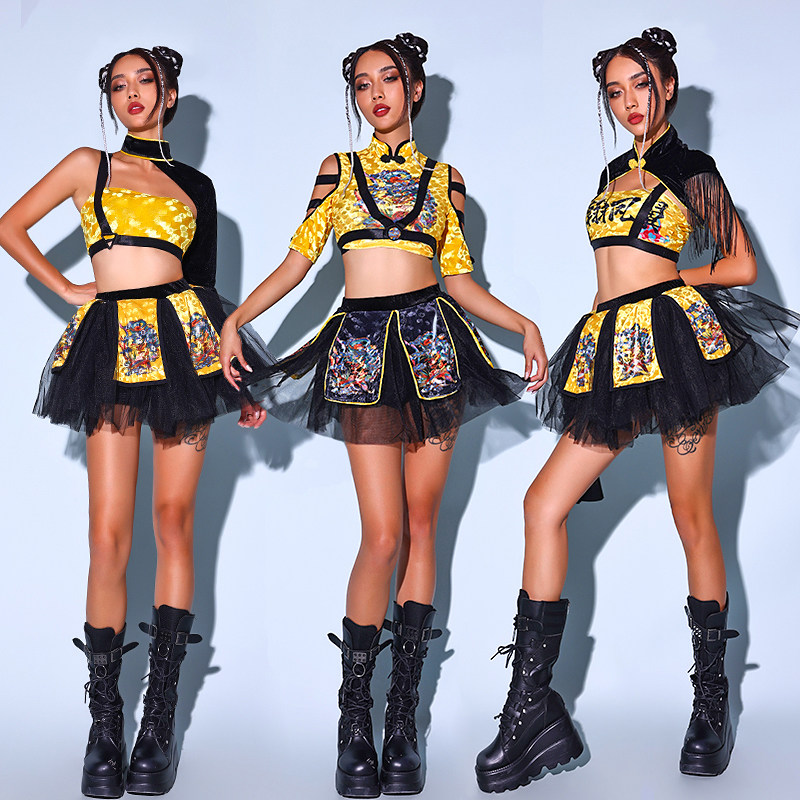 新款DS演出服酒吧gogo秀派对气氛女dj领舞性感黄色牛仔爵士舞套装