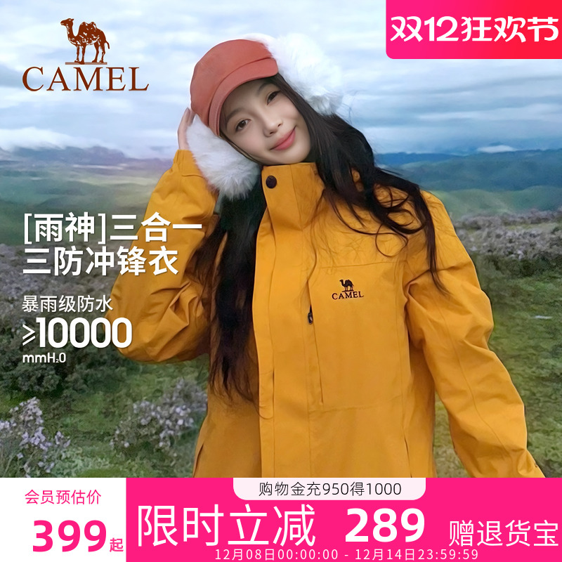 骆驼雨神三合一冲锋衣男女黄色外套2025冬季新款加绒加厚登山服装