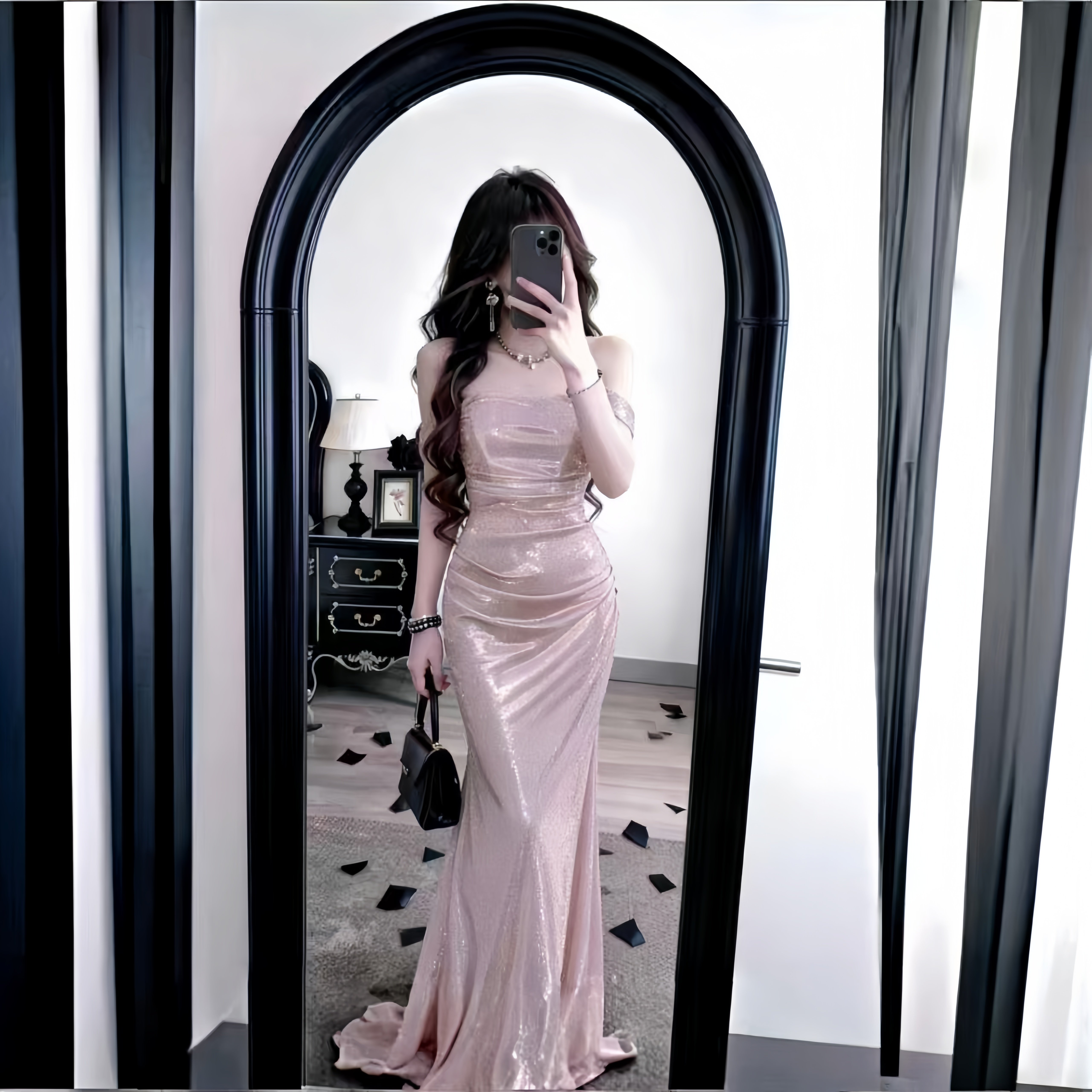 亮片晚礼服裙高端轻奢小众一字肩主持人年会连衣裙鱼尾高级感艺考