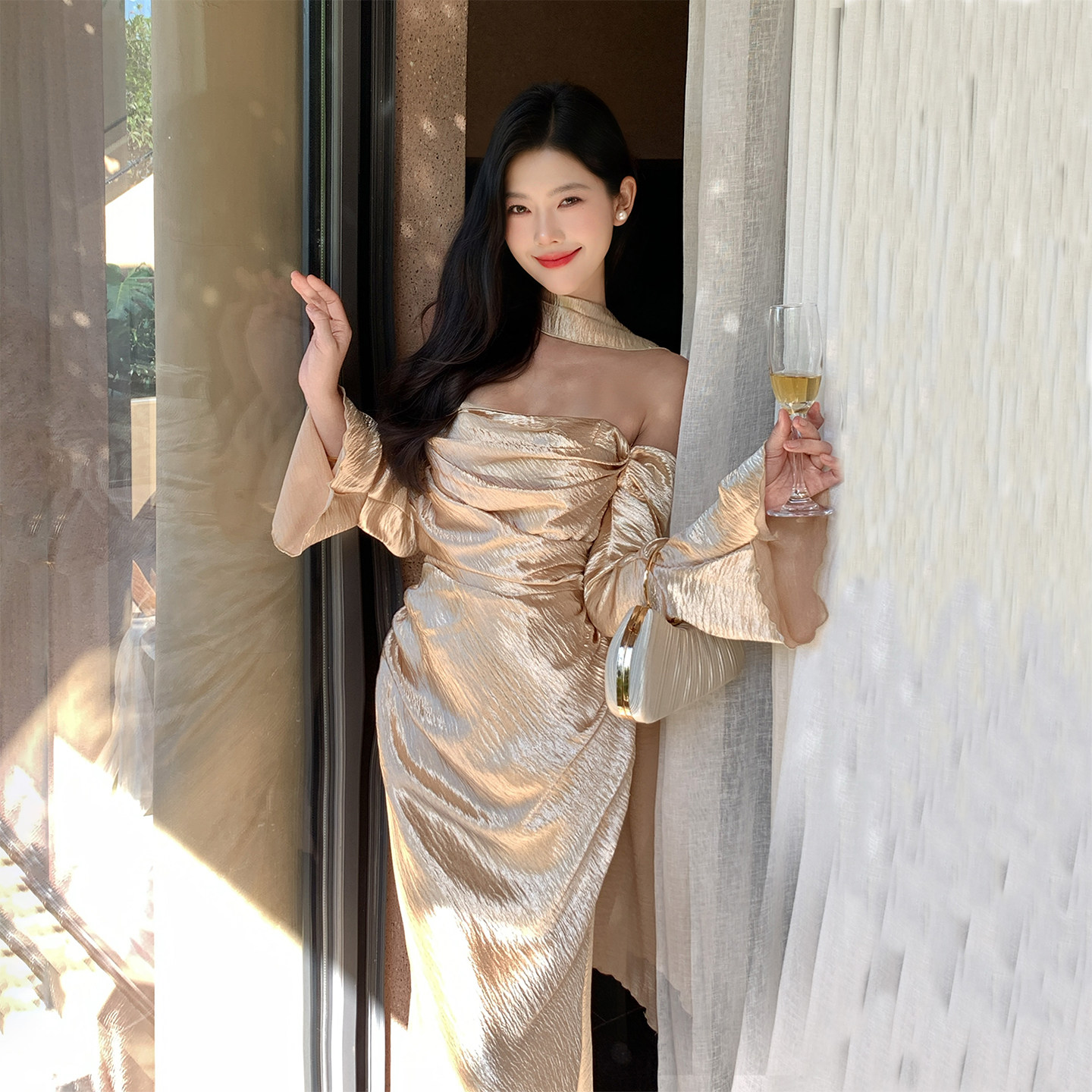 金色晚礼服女高级感气质宴会轻奢小众高端小个子年会主持人连衣裙