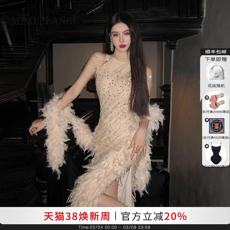 MIMI PLANGE重工年会小礼服羽毛钉珠刺绣立领钻链连衣长裙26SS