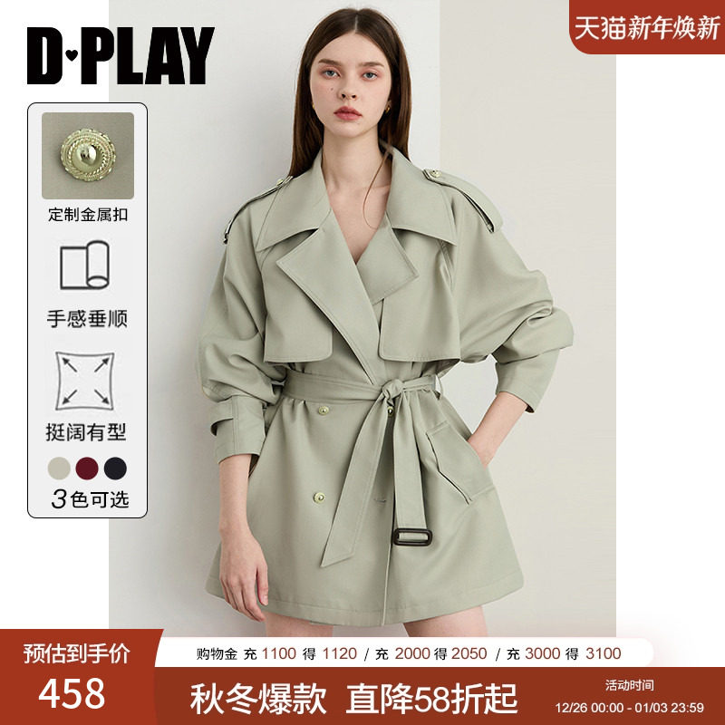 DPLAY2026年春季新款绿色风衣外套女短款好看流行气质小个子大衣