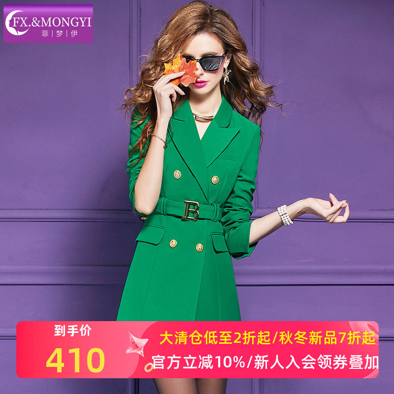 菲梦伊绿色西装连衣裙女秋季新款干练气质通勤收腰小个子风衣外套