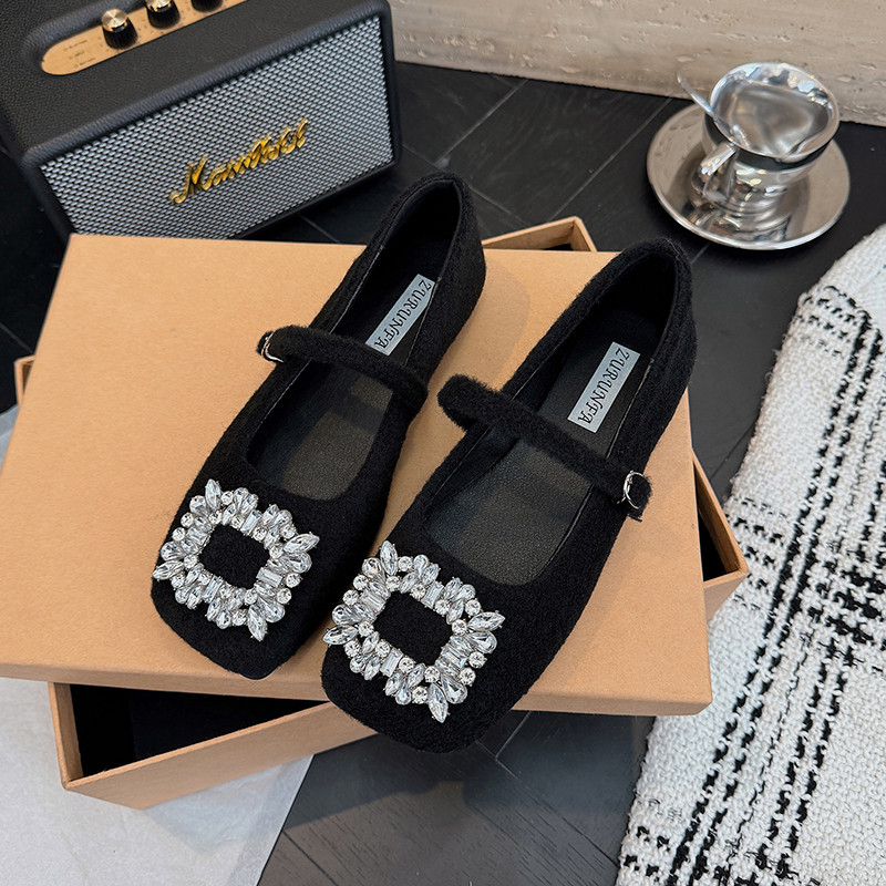 法式毛呢平底玛丽珍单鞋女2025新款秋冬一字扣勃肯鞋毛毛鞋豆豆鞋
