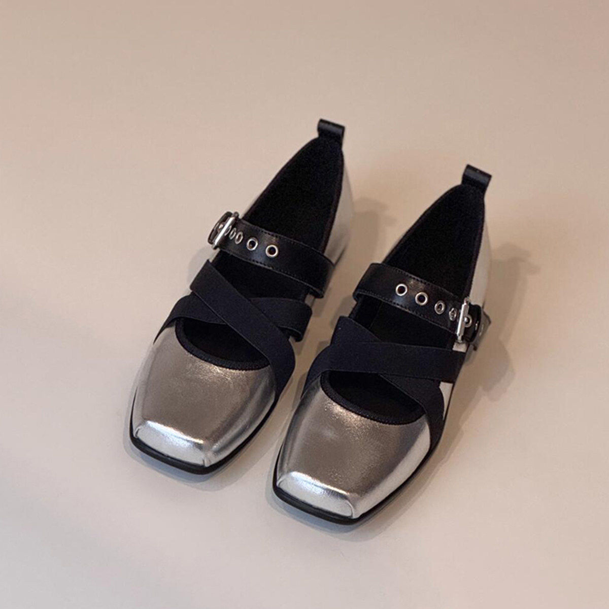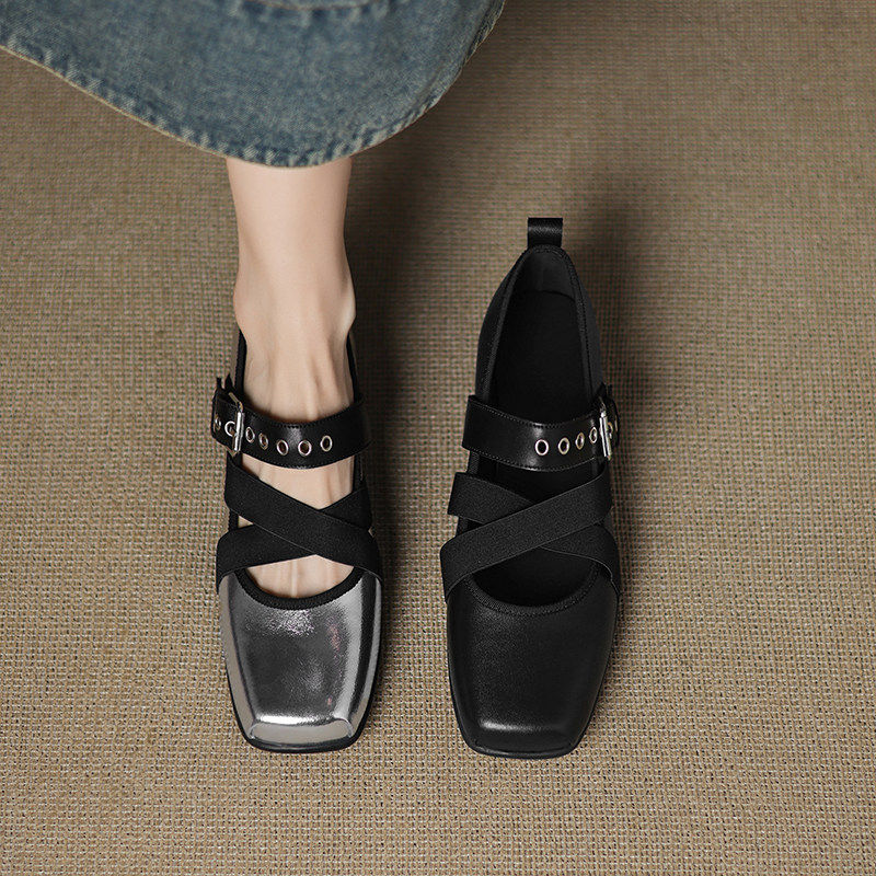 羊皮版~法式芭蕾风交叉带方头玛丽珍鞋女一字扣浅口运动平底单鞋