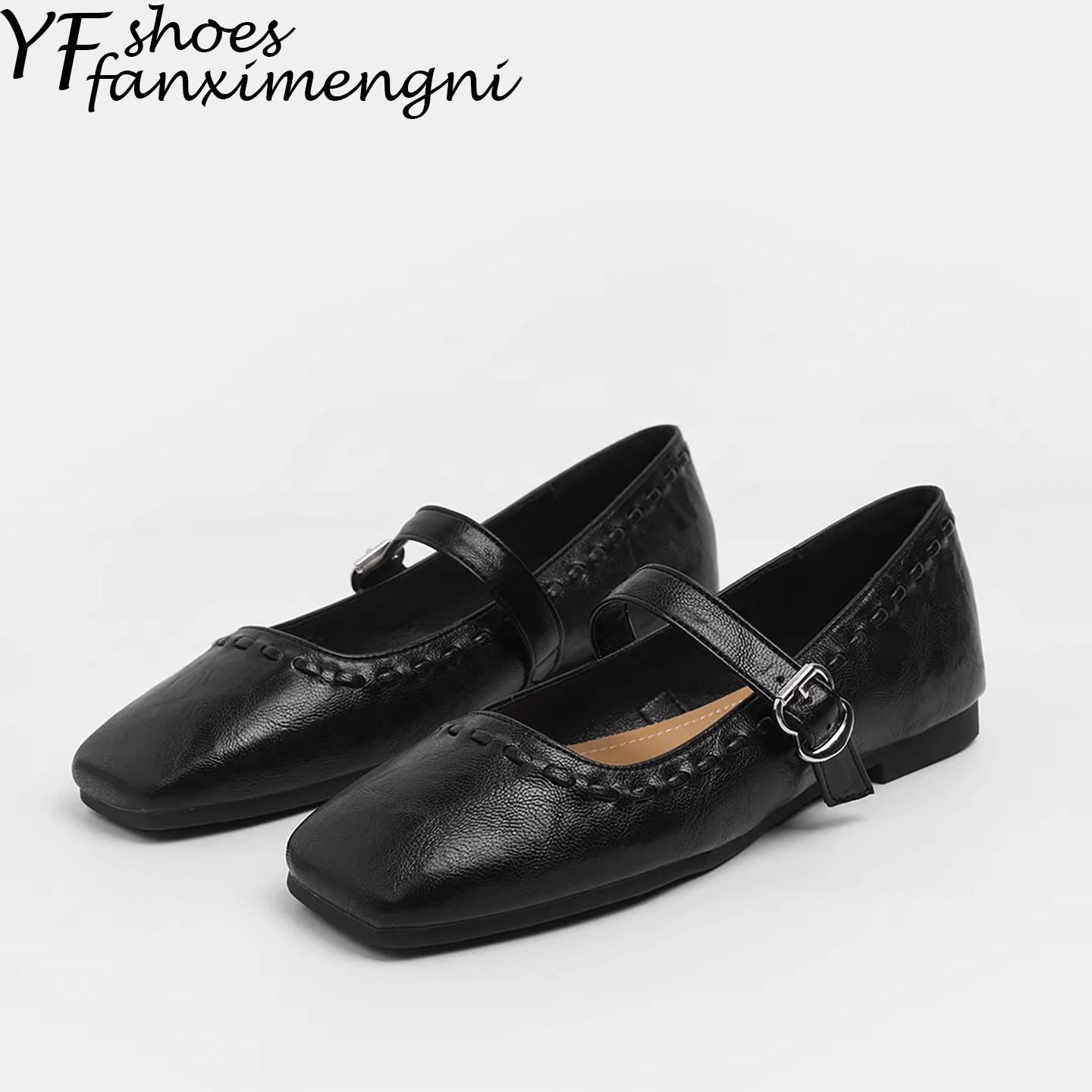 简约软皮方头浅口单鞋女气质一字扣带通勤平底女鞋法式玛丽珍女鞋