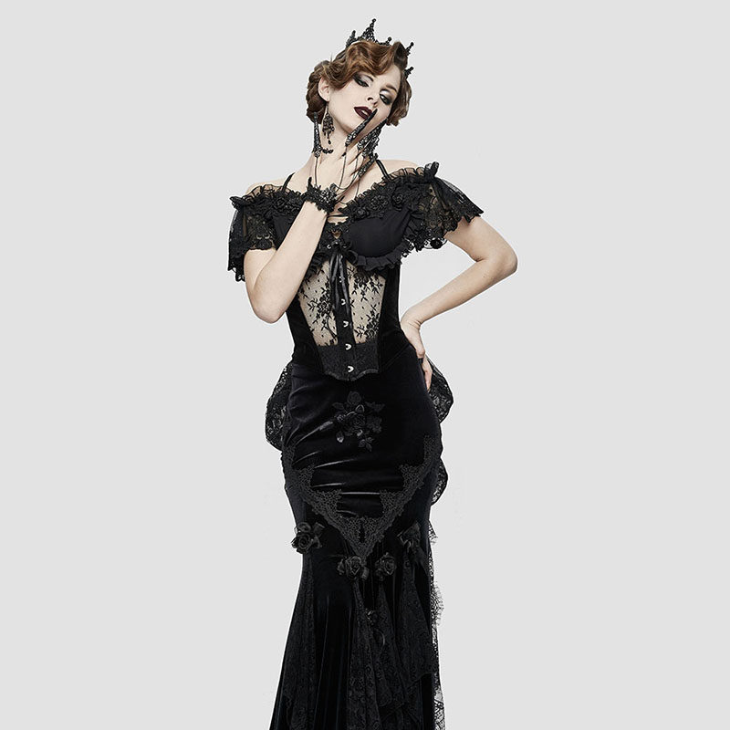 哥特短袖T恤长尾可拆束身衣收腹塑形蕾丝玫瑰花纹性感上衣舞台cos