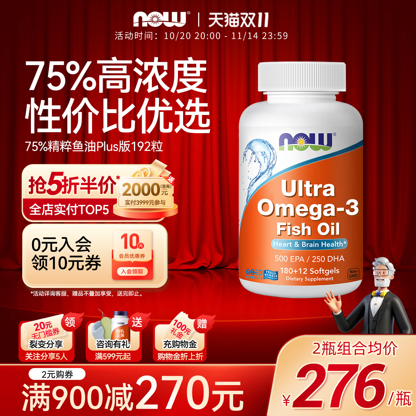 NOW鱼油深海鱼油软胶囊中老年omega3呵护心脑人猫通用美国进口