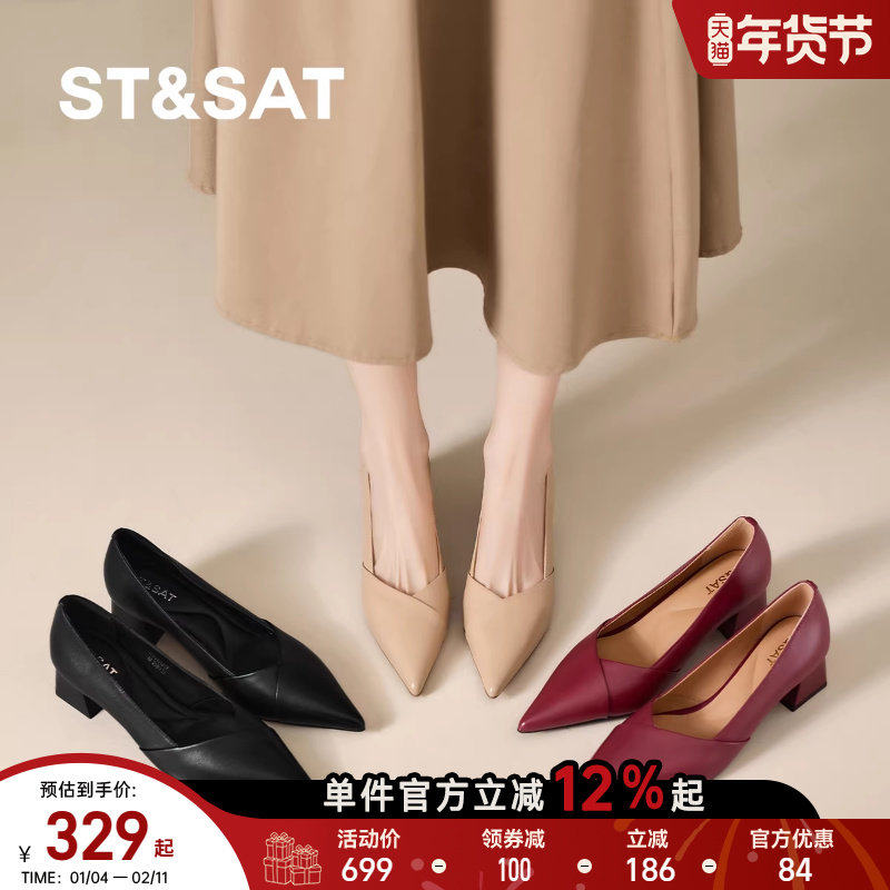 星期六复古尖头高跟浅口单鞋女秋季新款不累脚粗跟工作通勤小皮鞋