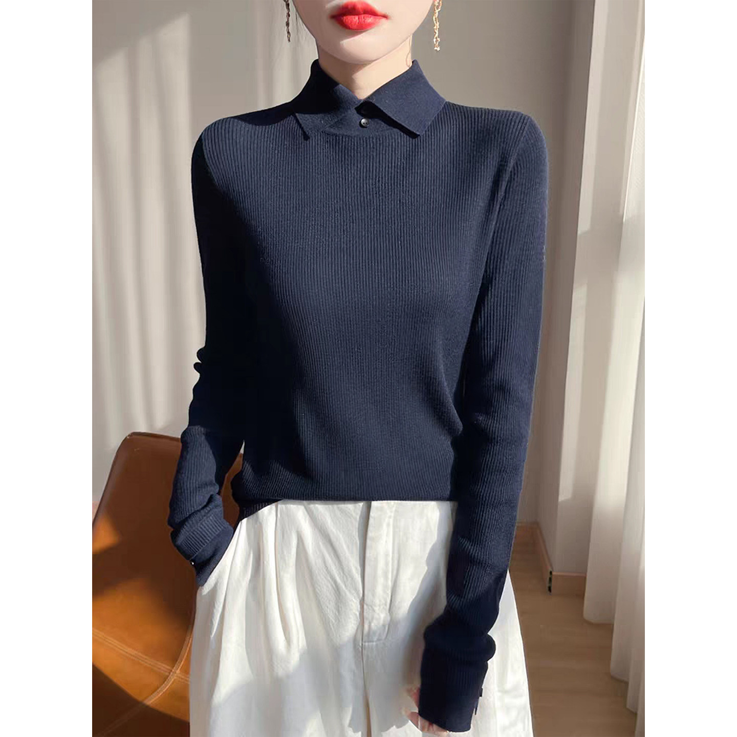 设计感翻领纽扣针织衫女装秋冬新款气质高级感气质羊毛打底衫毛衣