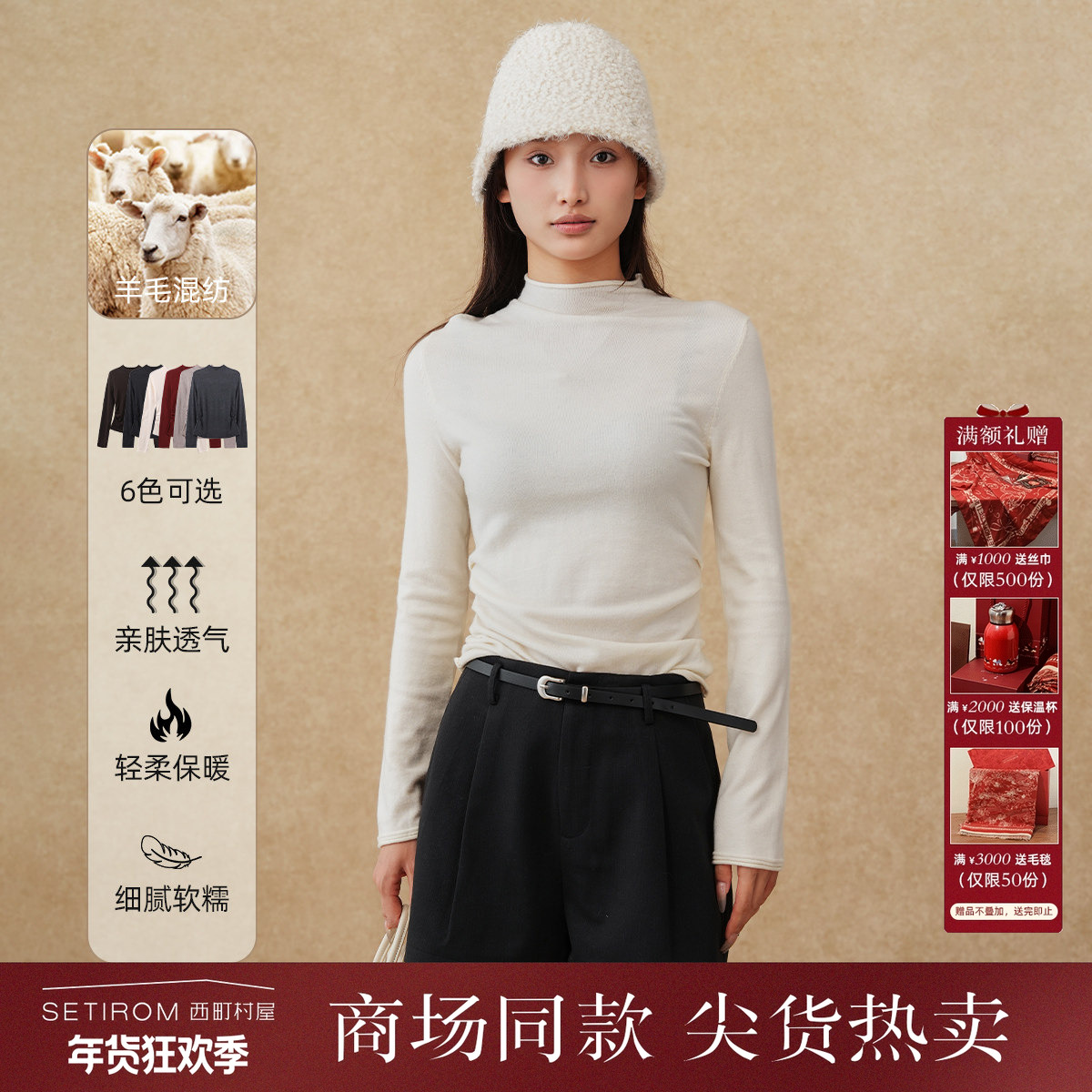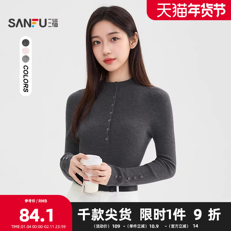 三福打底毛衫2025冬季纽扣小中领保暖内搭毛针织衫女装513175