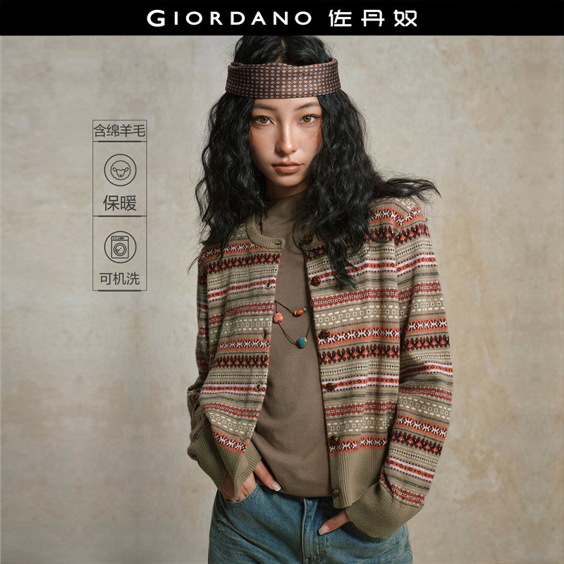 设计师款佐丹奴针织衫女装撞色提花宽松圆领费尔岛风开衫18355826