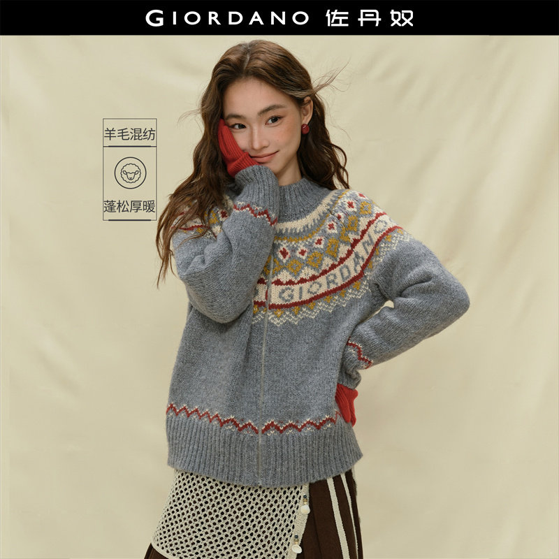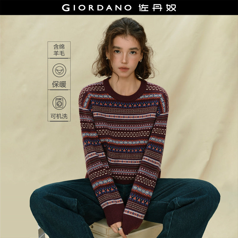 设计师款佐丹奴针织衫女装复古风提花宽松圆领费尔岛毛衣18355619