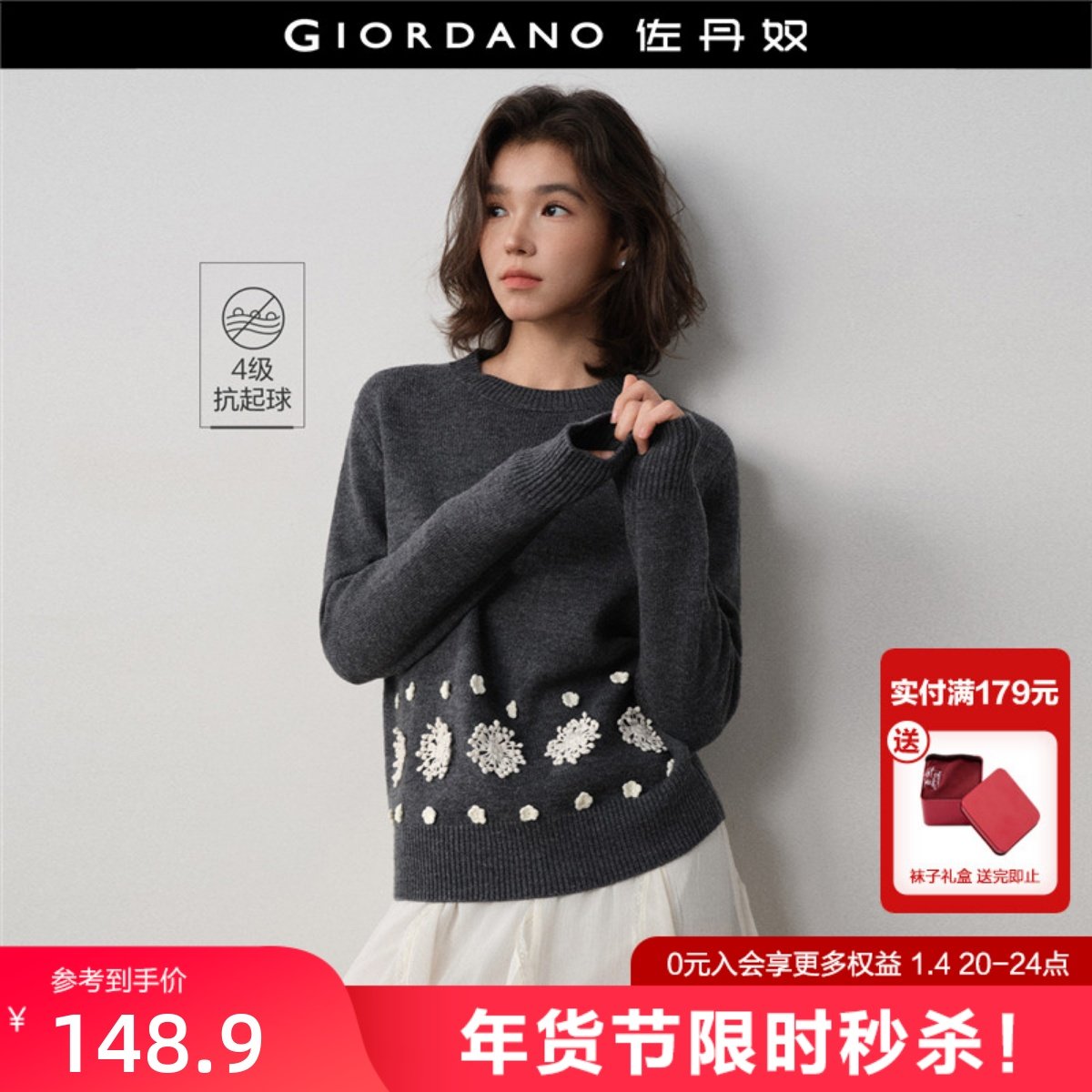 设计师款佐丹奴针织衫女装新款立体勾花宽松圆领套头毛衣18355618