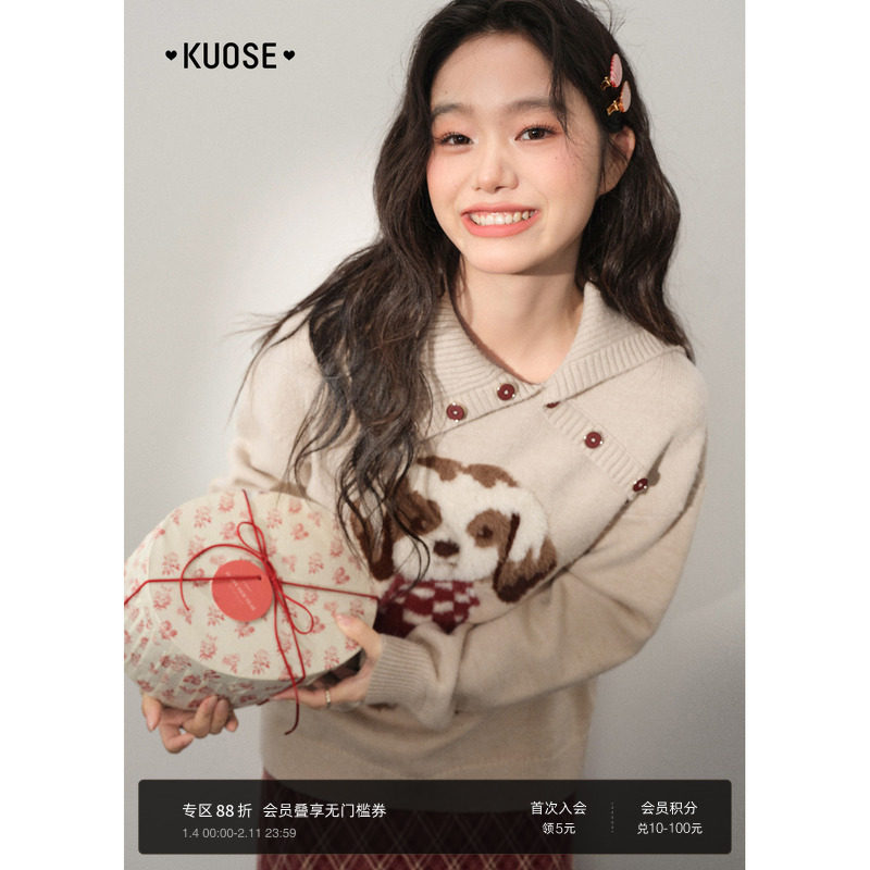 阔色杏色设计感翻领毛绒小狗针织衫女装2025秋冬季新款毛衣上衣