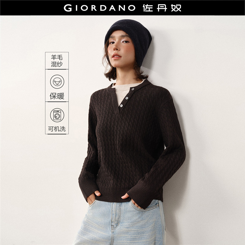 设计师款佐丹奴针织衫女装新款羊毛混纺镂空圆领宽松毛衣18355726