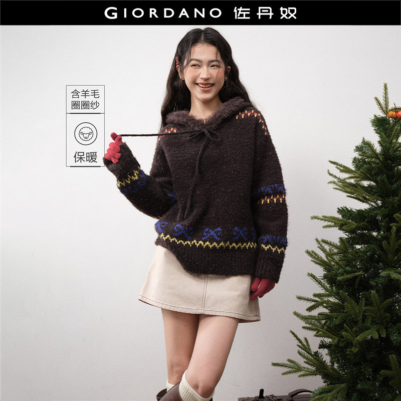 设计师款佐丹奴毛边连帽针织衫女装撞色提花宽松针织毛衣18355522
