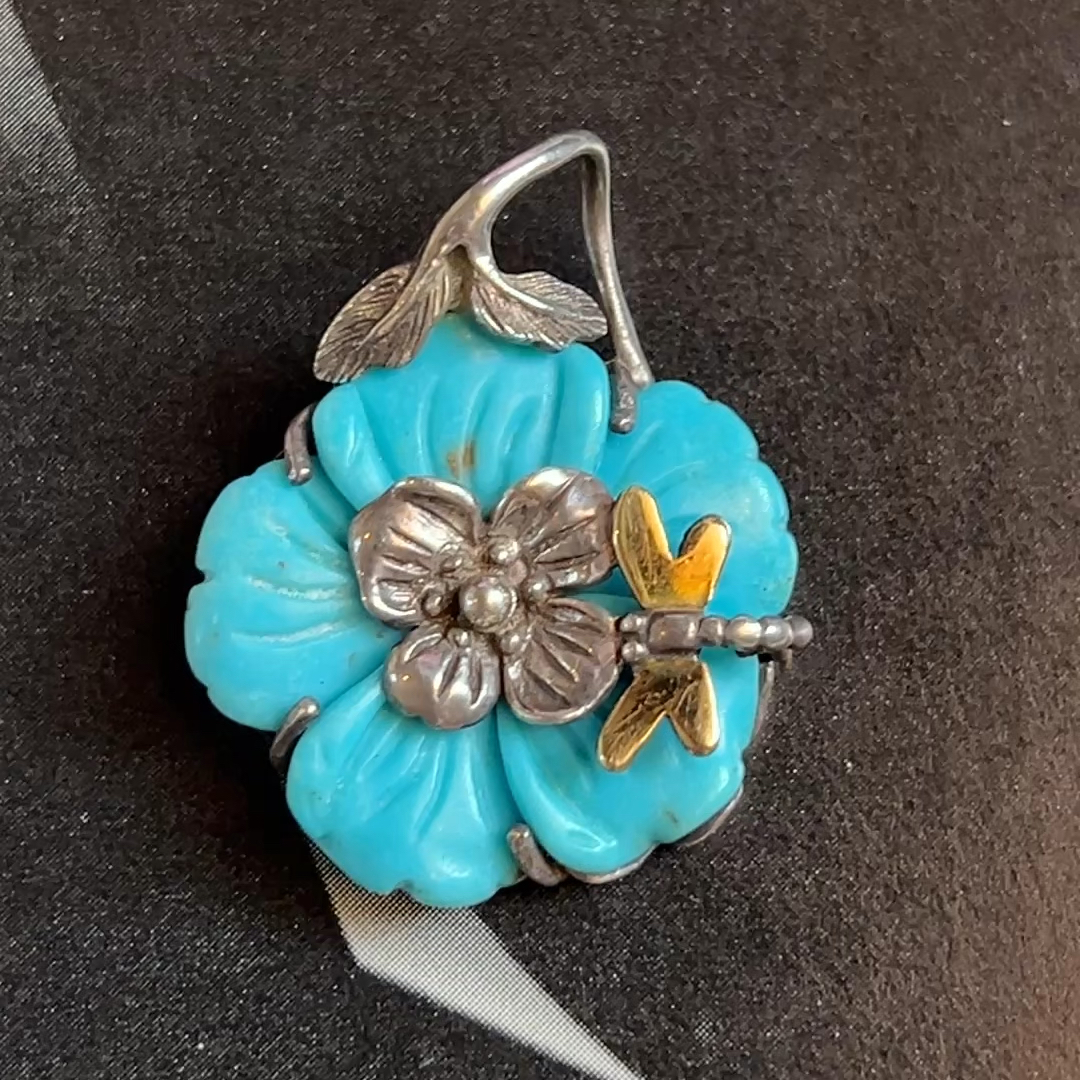创汇期出口古董首饰天然原矿绿松石吊坠18K金吊坠925纯银掐丝吊坠