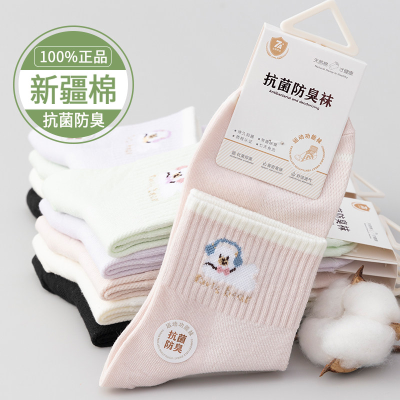 中筒袜女袜纯棉新疆棉100%正品抗菌防臭袜可爱卡通网眼透气学生袜