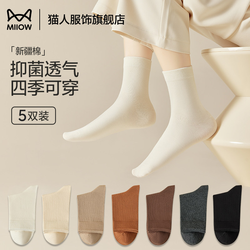 猫人秋冬女袜纯棉抑菌无骨小白袜透气纯棉春夏四季女生纯棉中筒袜