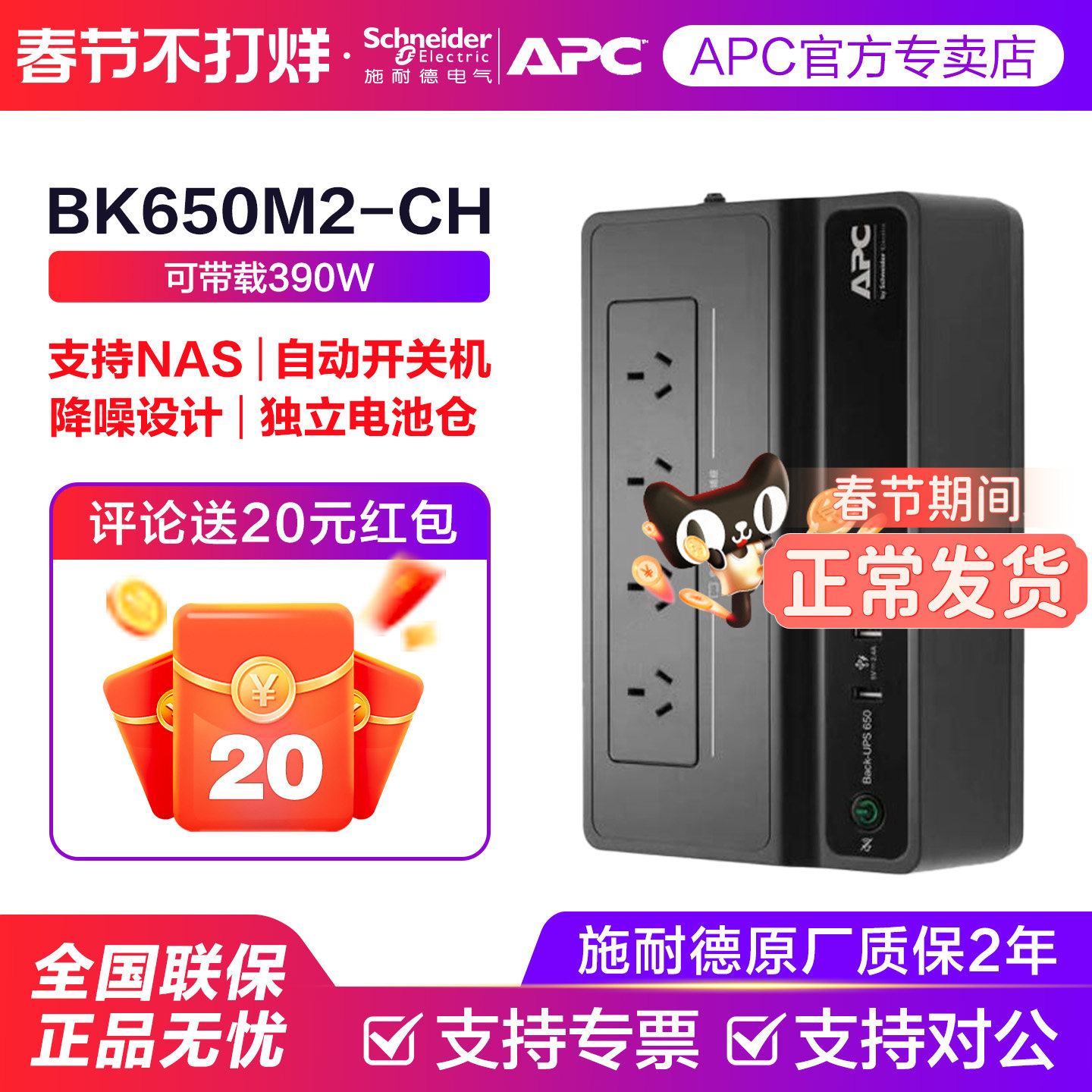 施耐德APC UPS不间断电源BK650M2电脑群晖 NAS威联通停电备用电池