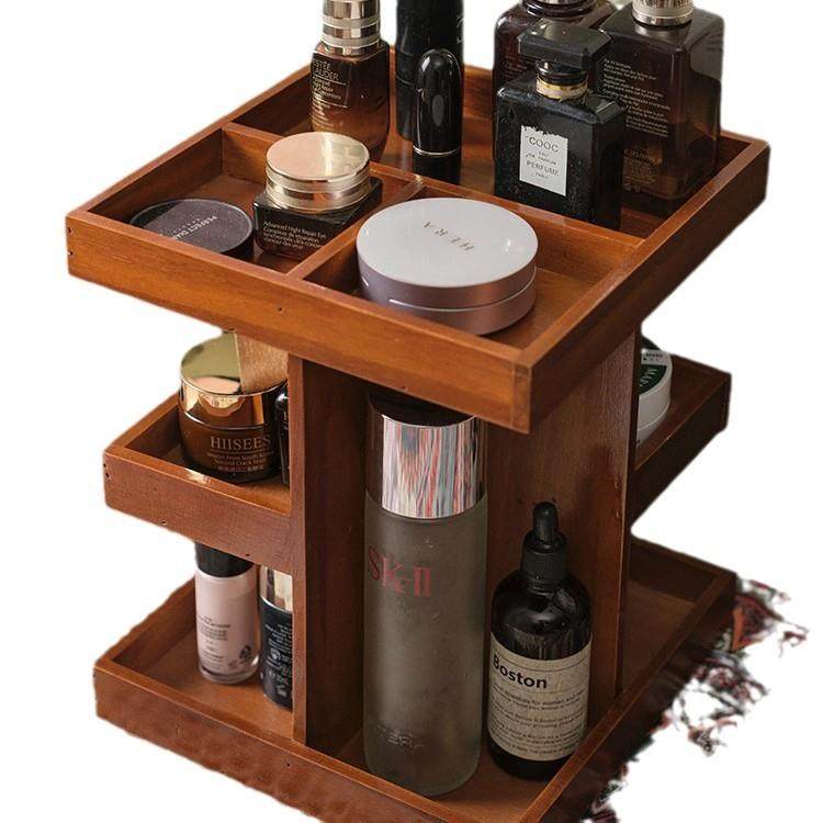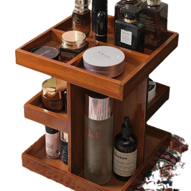 复古可旋转木质化妆品收纳盒桌面梳妆台护肤品口红整理置物架分层