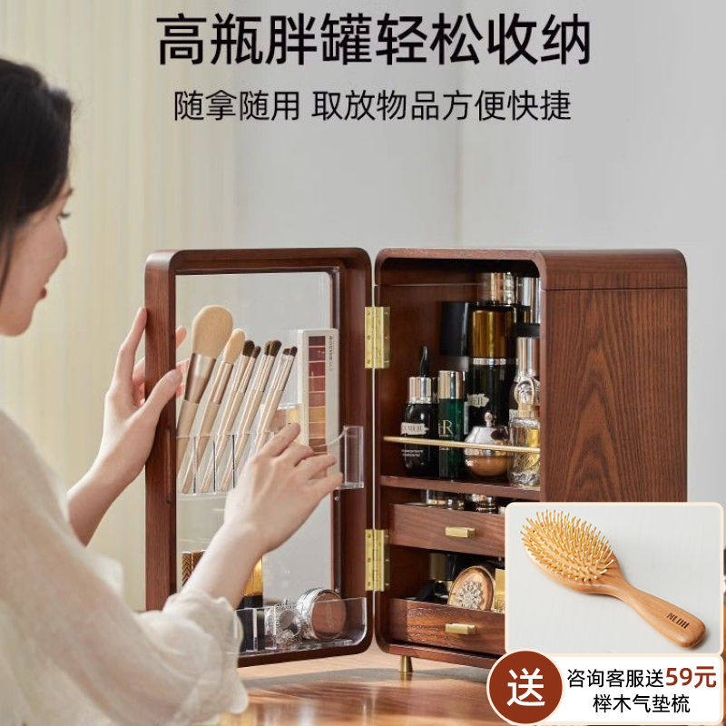 木质化妆品收纳盒防尘大容量桌面护肤品首饰一体收纳盒高级梳妆台