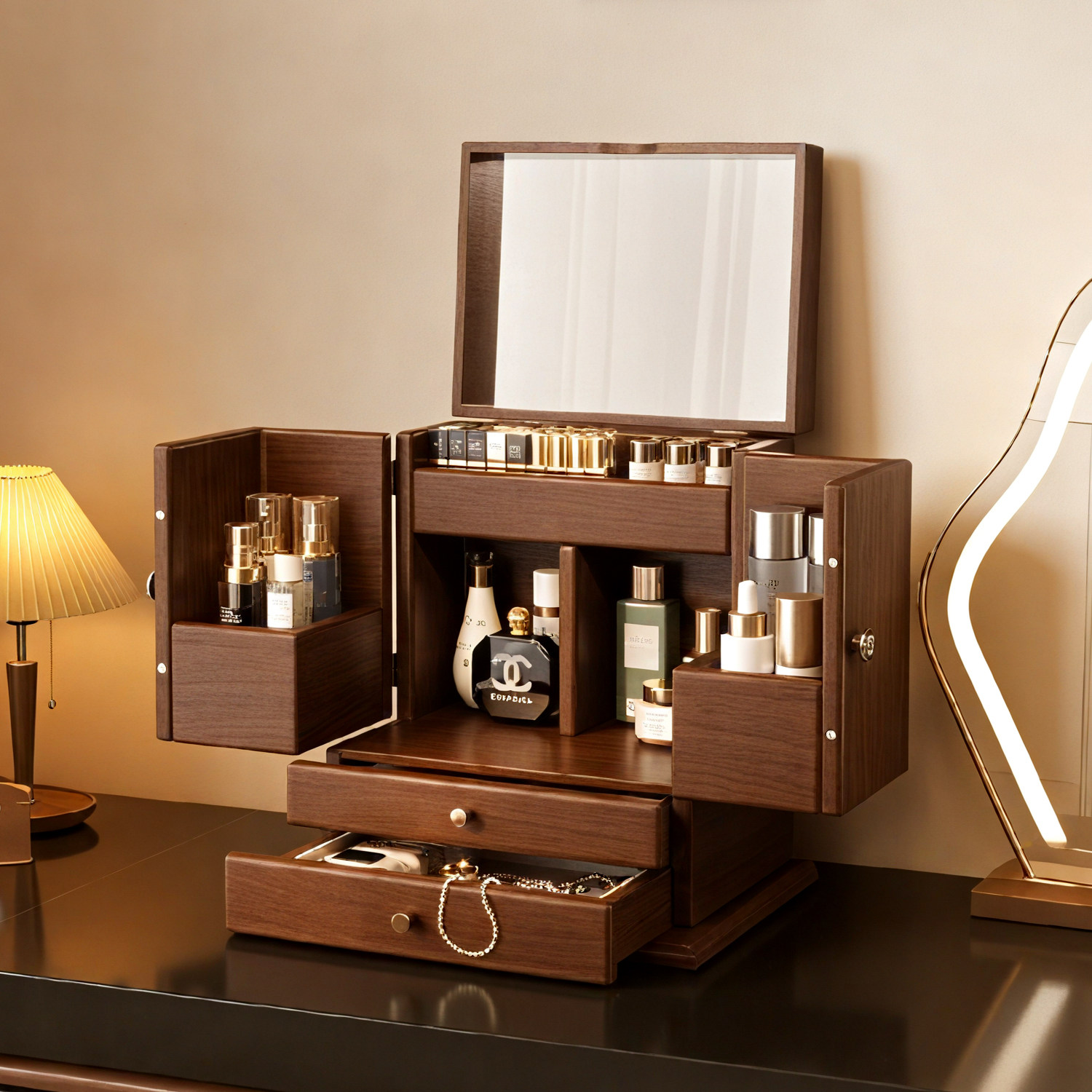 梵瀚 木质化妆品收纳盒带镜子一体防尘2025新款桌面护肤品收纳盒