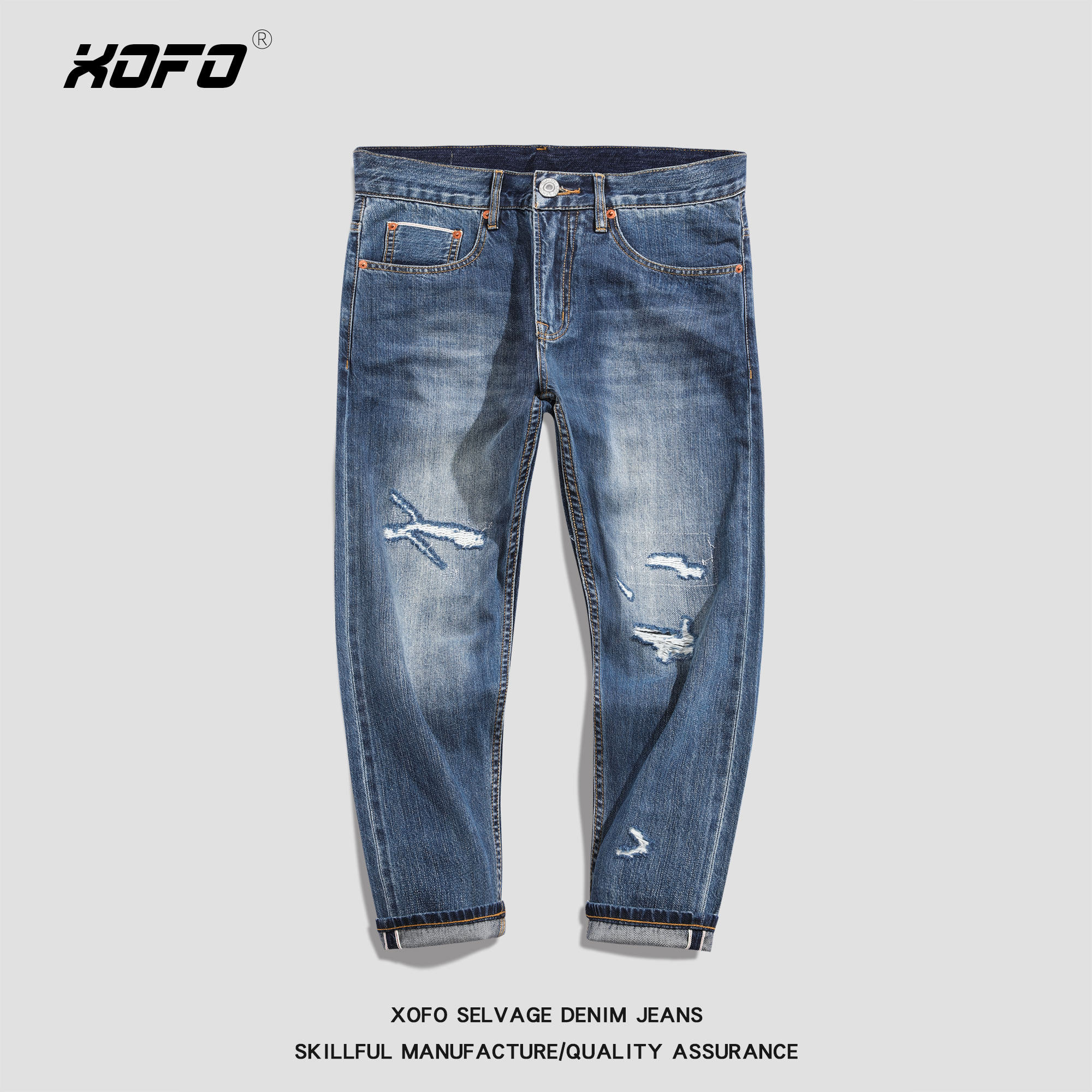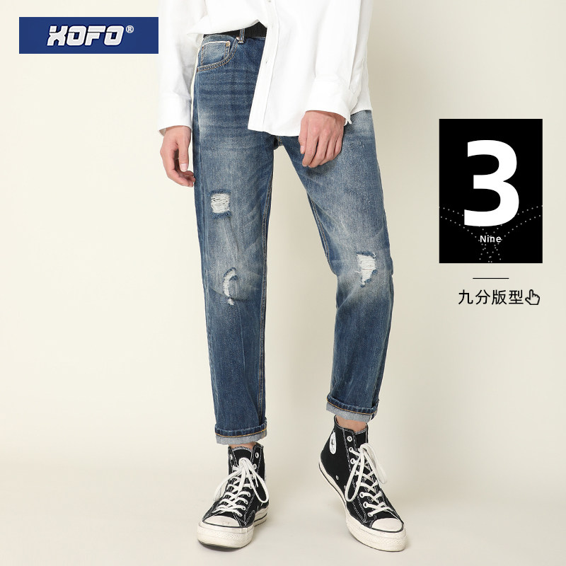 XOFO男装新款 冬款港风休闲复古直筒宽松舒适破洞九分牛仔裤子