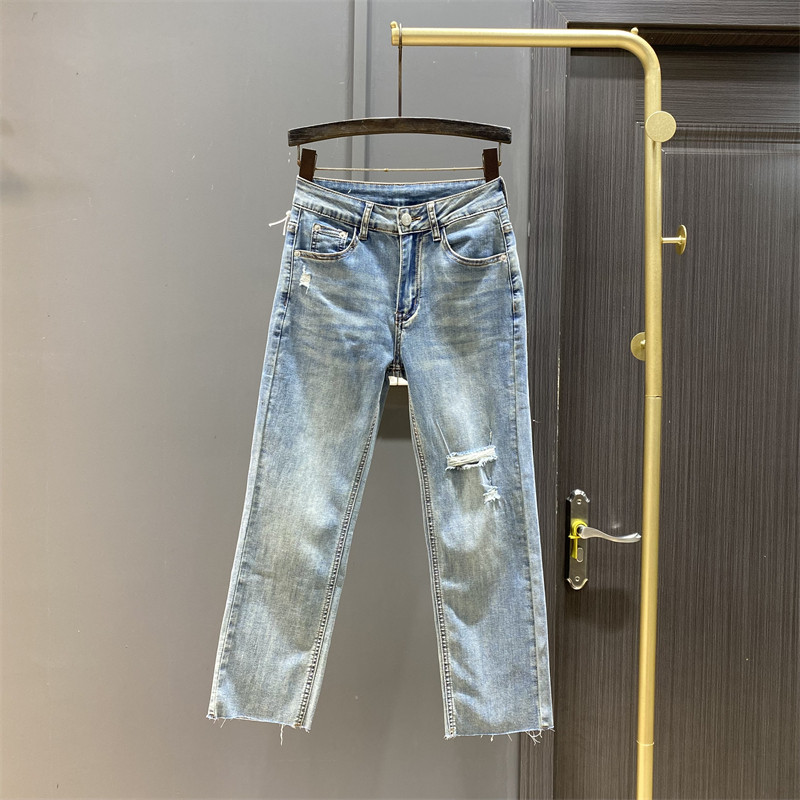 春夏韩版大码胖mm破洞九分牛仔裤女百搭宽松显瘦学生直筒老爹阔腿