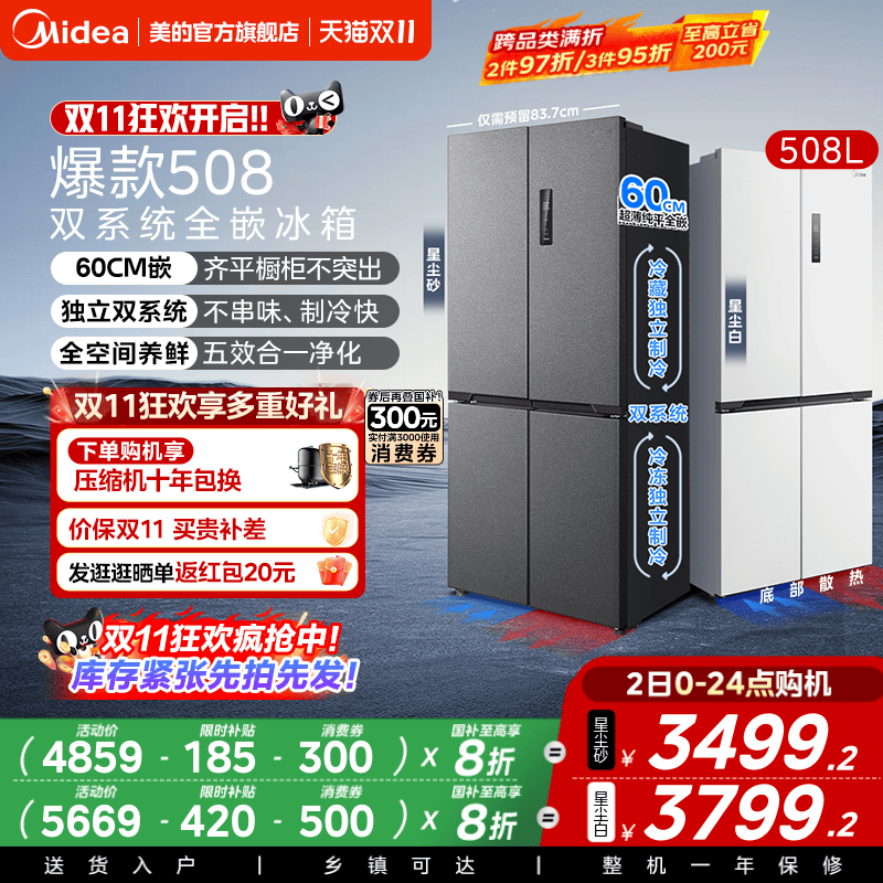 【李佳琦直播间生活节】美的508双系统零嵌冰箱十字双开四门家用