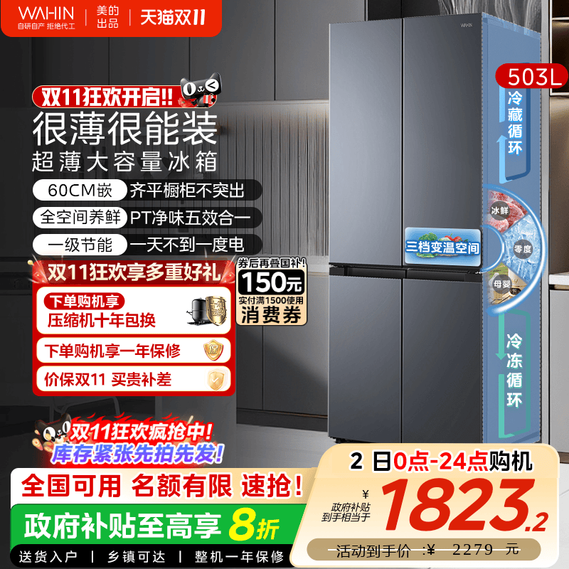 美的华凌419法式多门四门家用电冰箱零嵌入风冷无霜60cm超薄