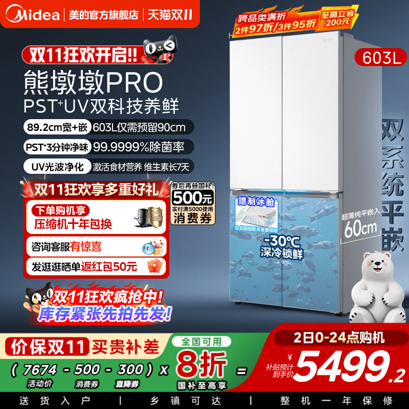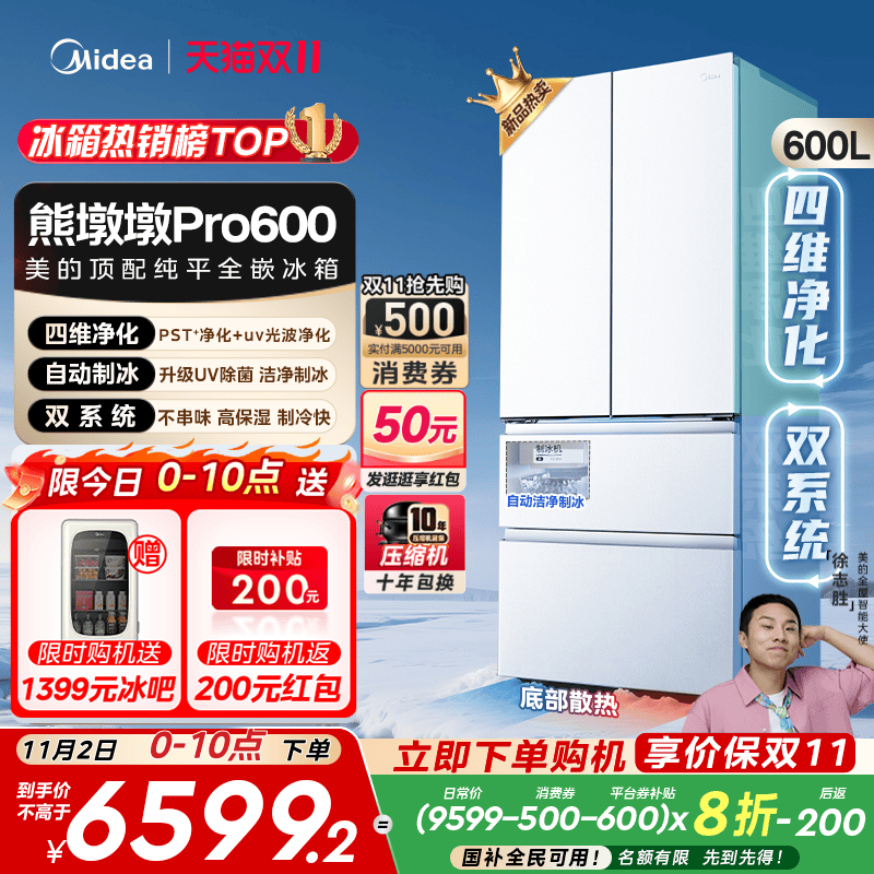 【新品】美的熊墩墩Pro600双系统零嵌自动制冰法式双开门家用冰箱
