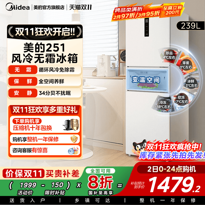 【政府换新补贴】美的249三门冰箱一级能效风冷无霜家用租房宿舍
