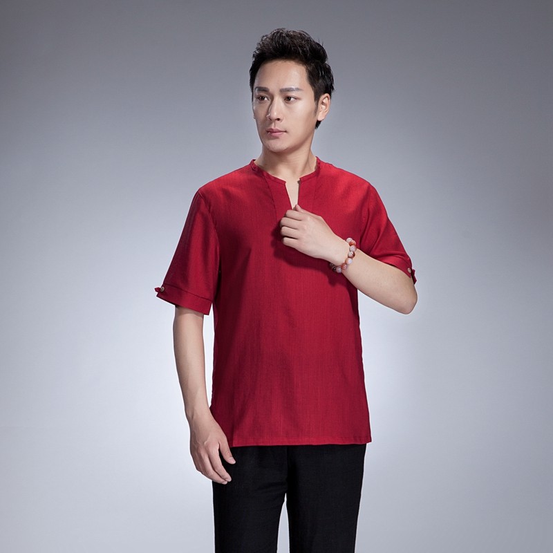 包邮新款棉麻唐装男青年短袖中装上衣夏装纯色中式中国风民族服装