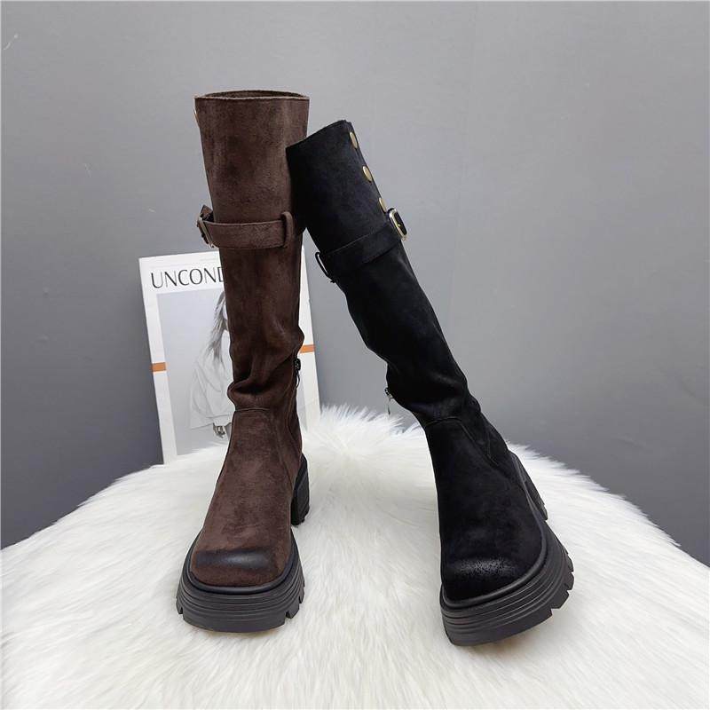 时尚巴克大叔折厚底长筒靴子女2024秋冬季新款加绒长靴过膝骑士靴