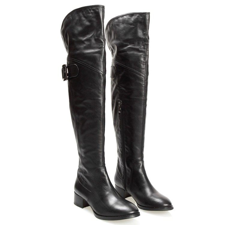 秋冬季真皮长靴过膝靴头层牛皮中跟黑色粗跟小圆头侧拉链欧美女靴