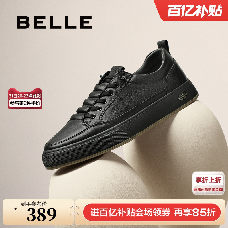 百丽男鞋免系带小白板鞋真牛皮男士黑色休闲运动工装板鞋子A1230
