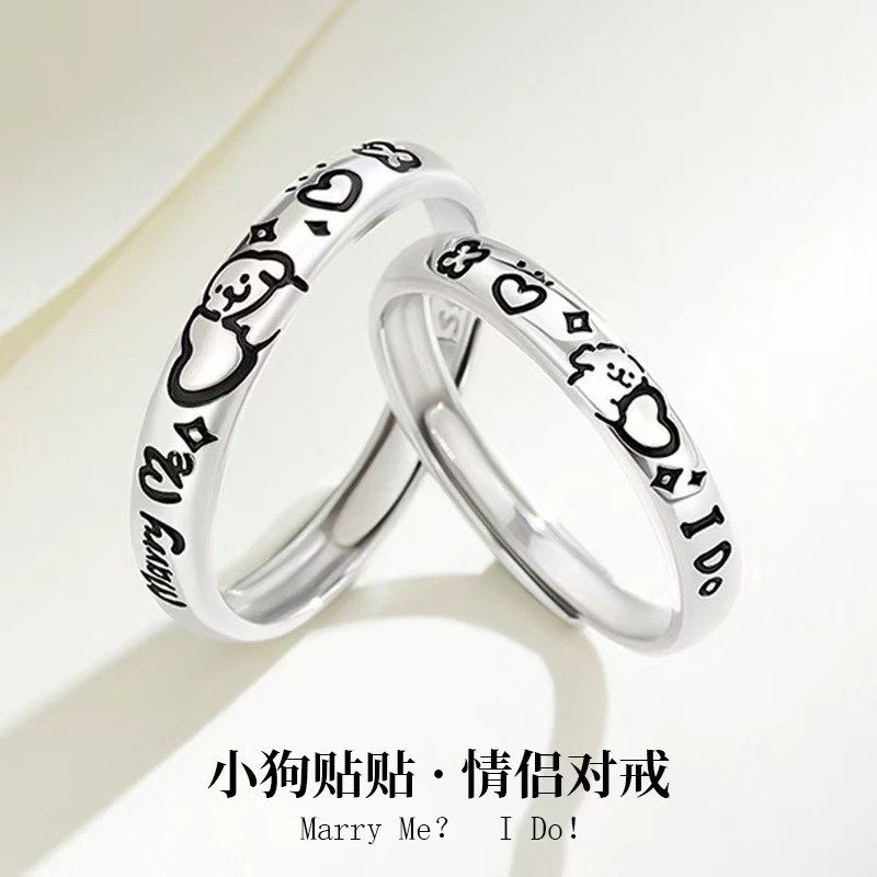 小狗贴贴925银情侣对戒男女一对简约指环活口婚介情人节生日礼物