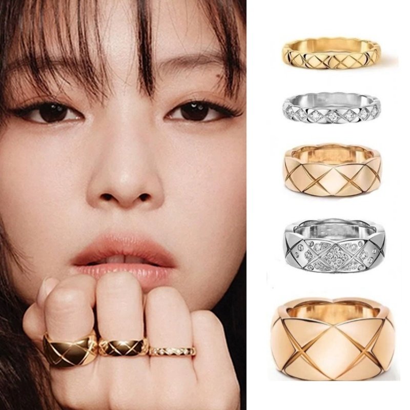 coco菱格纹戒指轻奢18k金镶钻叠戴宽窄版小香风925银情侣对戒指环