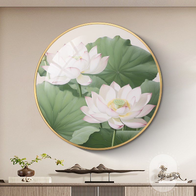 荷花玄关装饰画新中式客厅圆形挂画餐厅莲花静心茶室布置酒店壁画