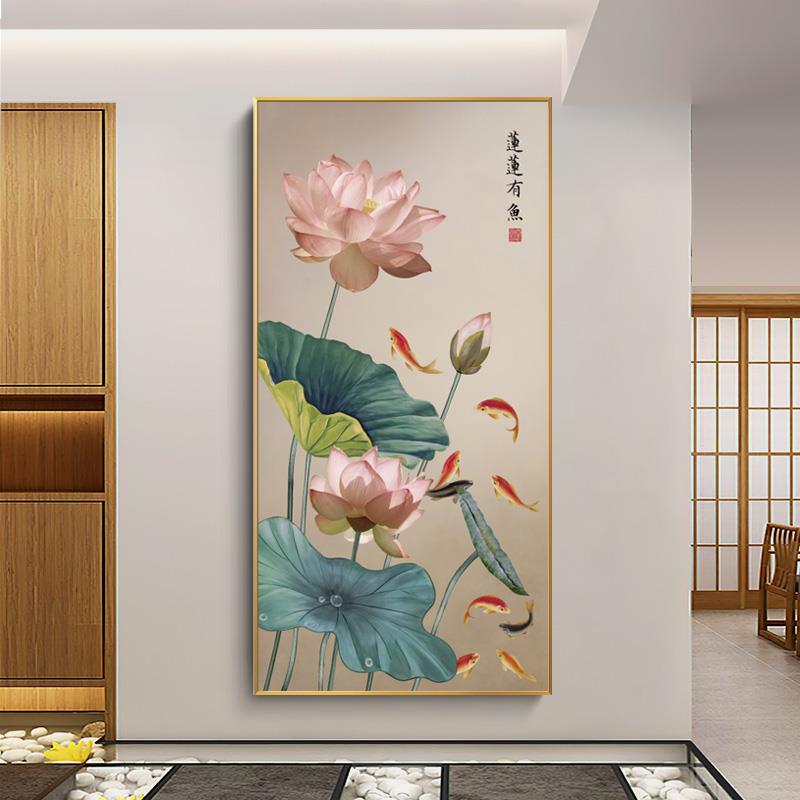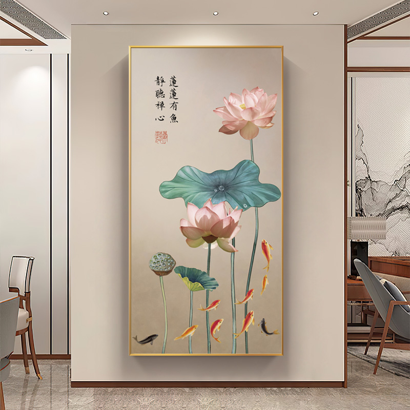 荷花玄关装饰画竖款新中式好运莲莲好寓意挂墙轻奢高级感氛围灯画
