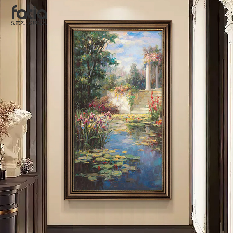 手绘油画荷花玄关装饰画复古风景走廊过道挂画欧式睡莲壁画高级感